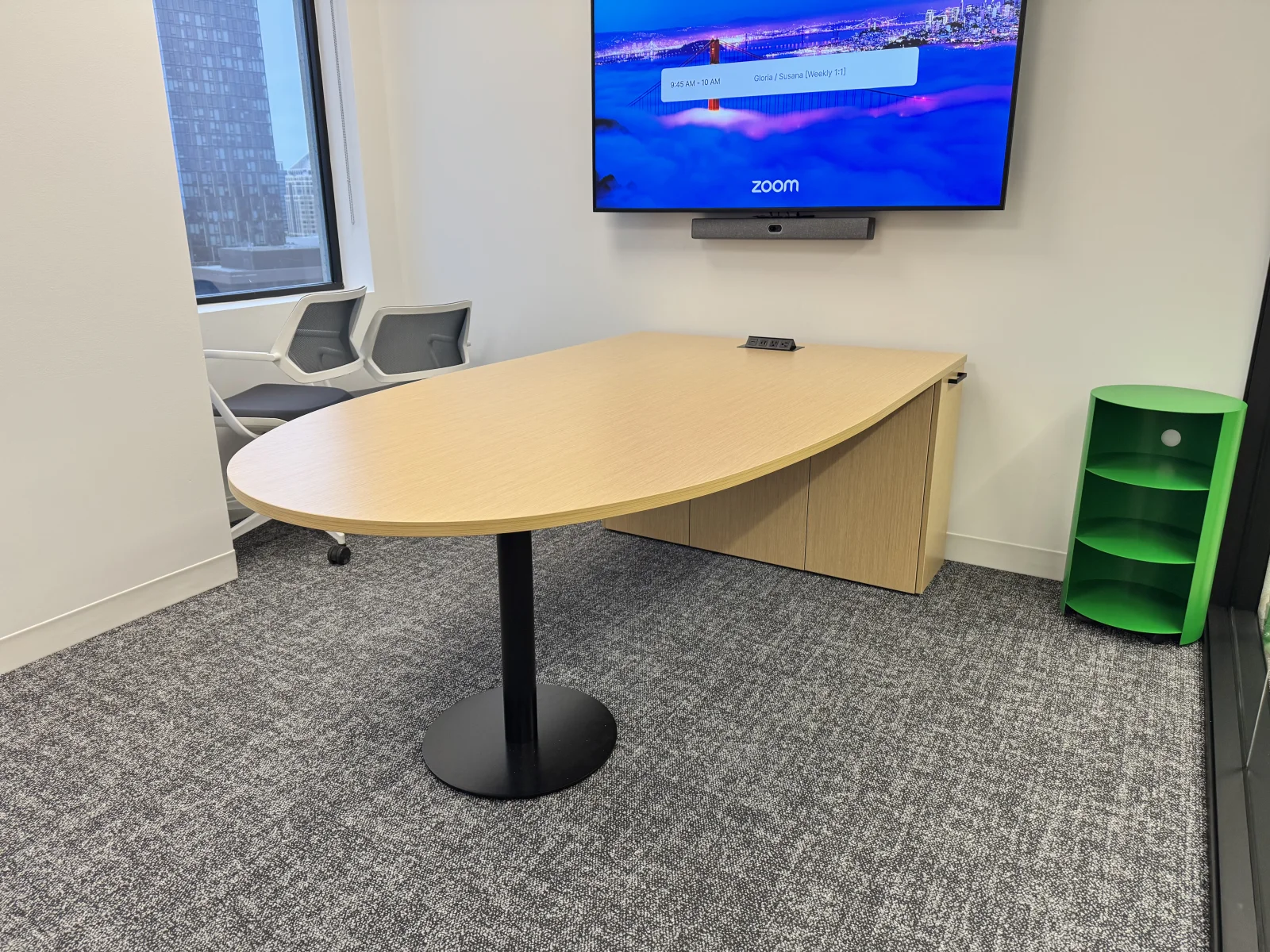 The new huddle table provides a practical surface for stand-ups, small-group work, and quick problem solving. Its shape encourages eye contact and balanced participation, while the base provides ample legroom and a clean look that supports modern technology use. Positioned near a display, the table helps teams move from conversation to content quickly, which is essential for hybrid or data-heavy workflows.