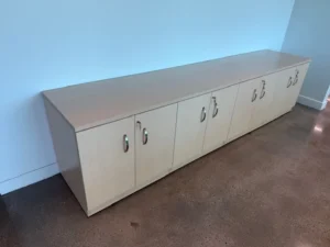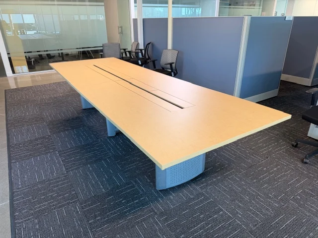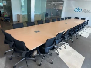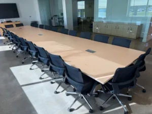 The project included installing a four-piece conference table measuring 60 inches by 288 inches. This table is the centerpiece of the main boardroom. The multi-section design lets you line things up perfectly and provides stable support across the entire room. Along the perimeter walls, two credenzas, 24 inches wide, 72 inches long, and 36 inches high, were also installed. They provide organized storage and give the room a finished look.
