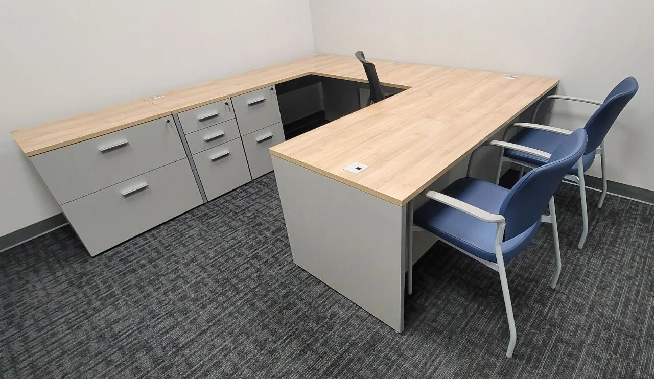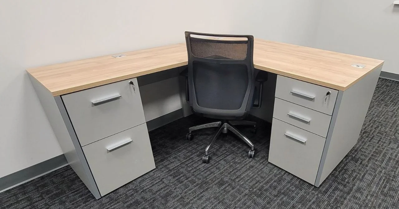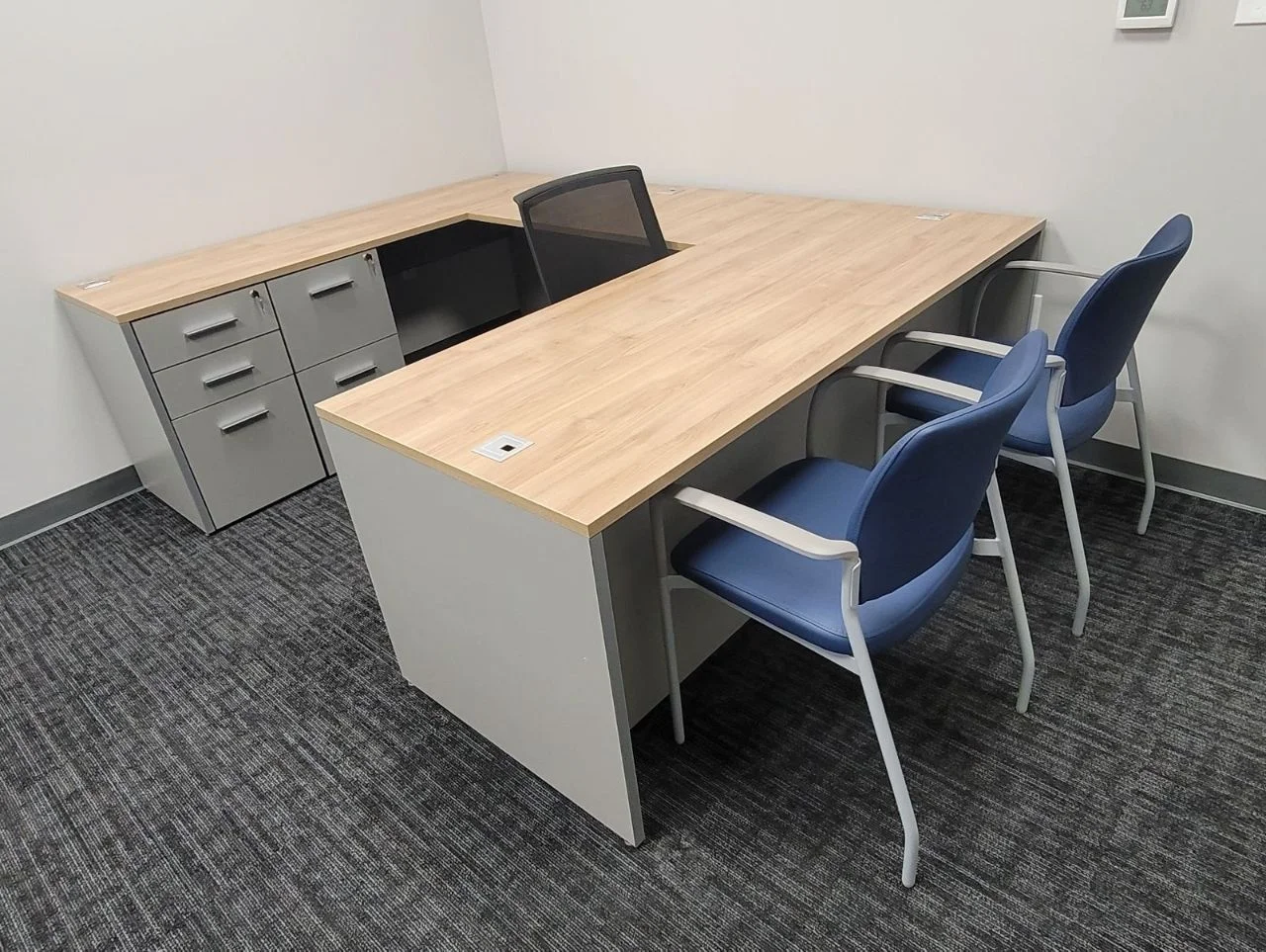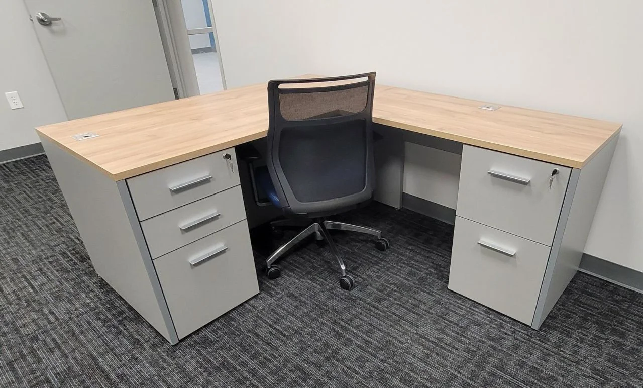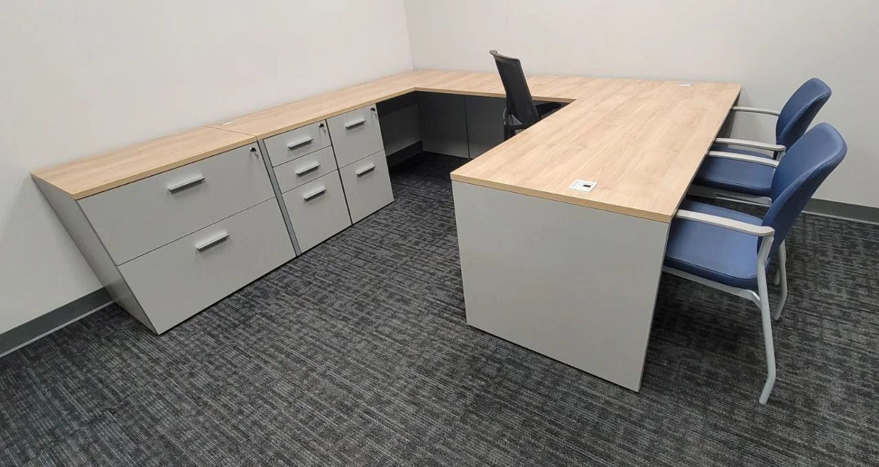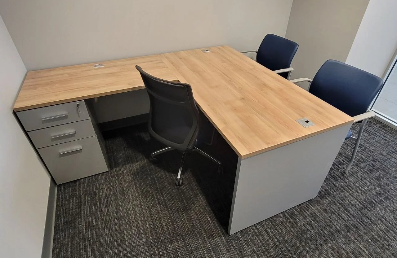 There were many L-shaped office desks with wood-grain work surfaces and neutral base cabinets put in private offices. These workstations have built-in power access, a clean surface alignment, and plenty of room for daily administrative tasks. Matching lateral file storage and credenza units were placed flush against the walls, keeping things neat and maintaining the office’s look. The way the desks were set up made it easy for people to move around and see clearly in each room.