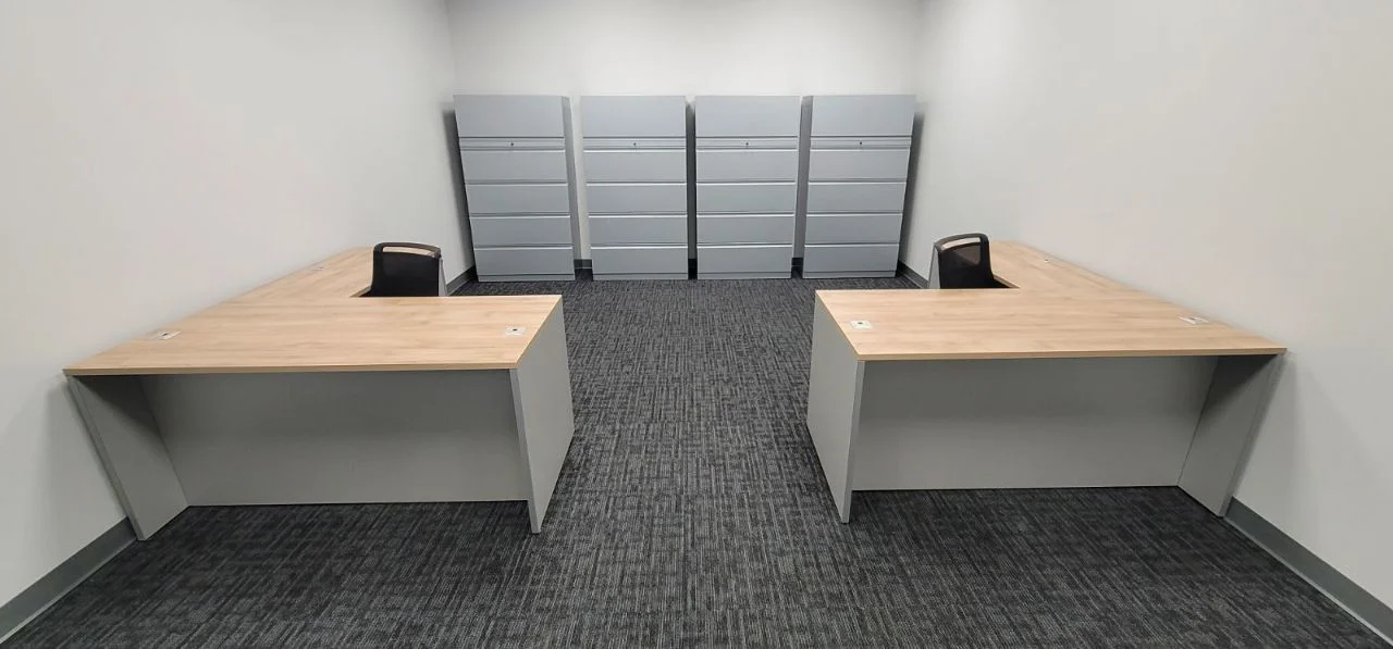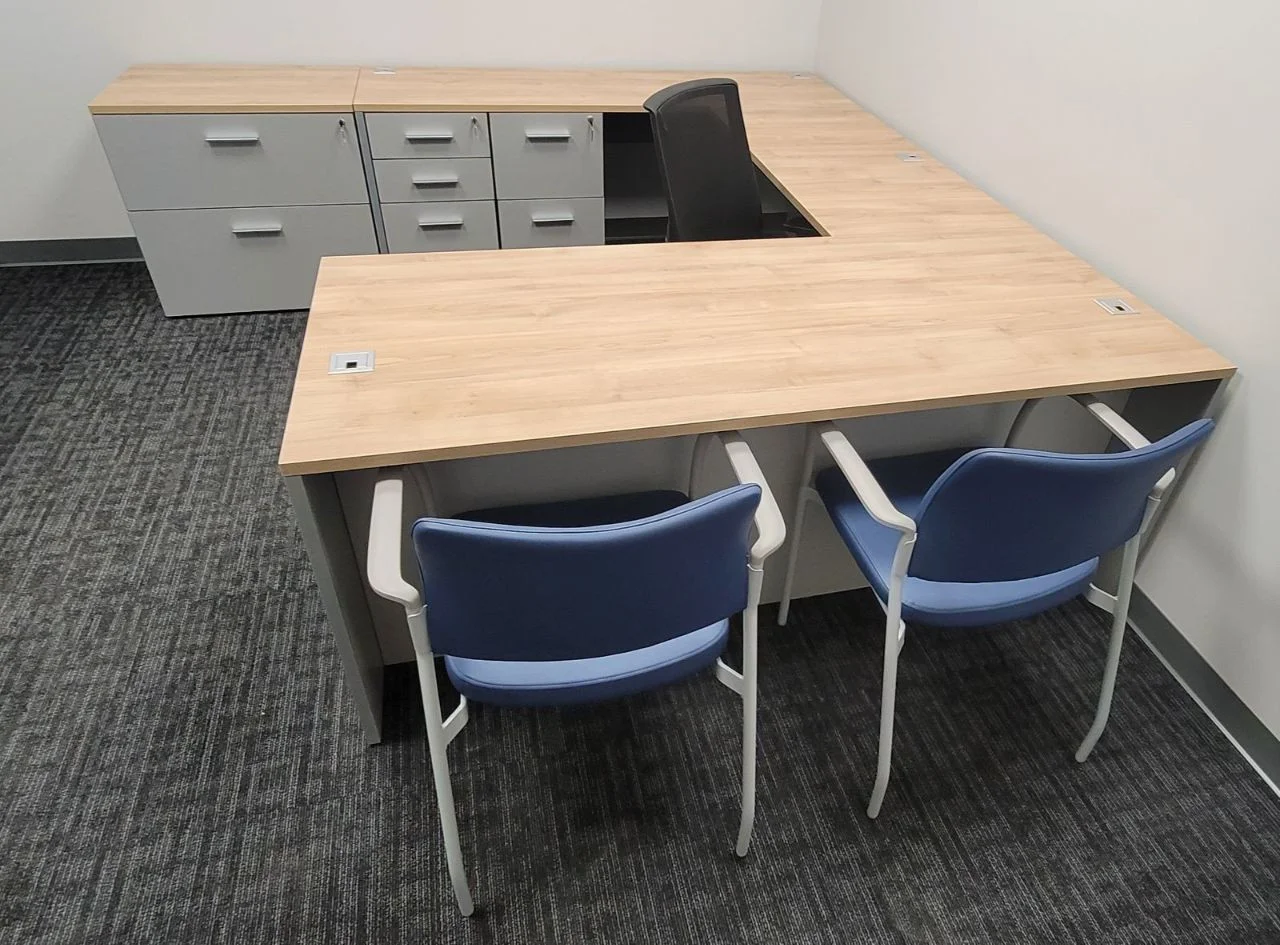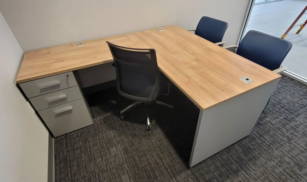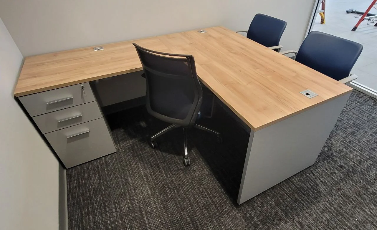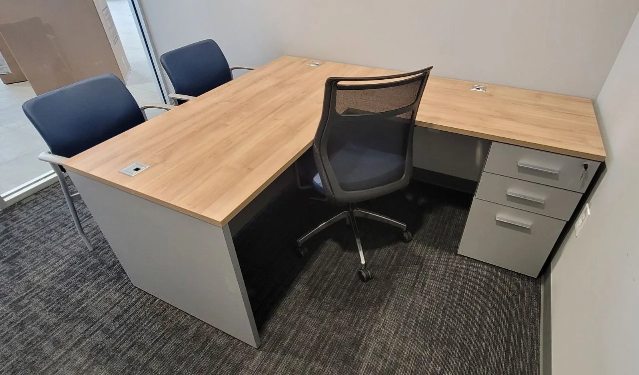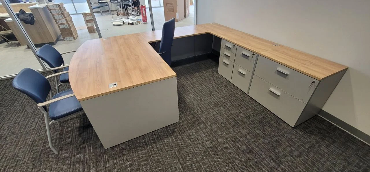 There were many L-shaped office desks with wood-grain work surfaces and neutral base cabinets put in private offices. These workstations have built-in power access, a clean surface alignment, and plenty of room for daily administrative tasks. Matching lateral file storage and credenza units were placed flush against the walls, keeping things neat and maintaining the office’s look. The way the desks were set up made it easy for people to move around and see clearly in each room.