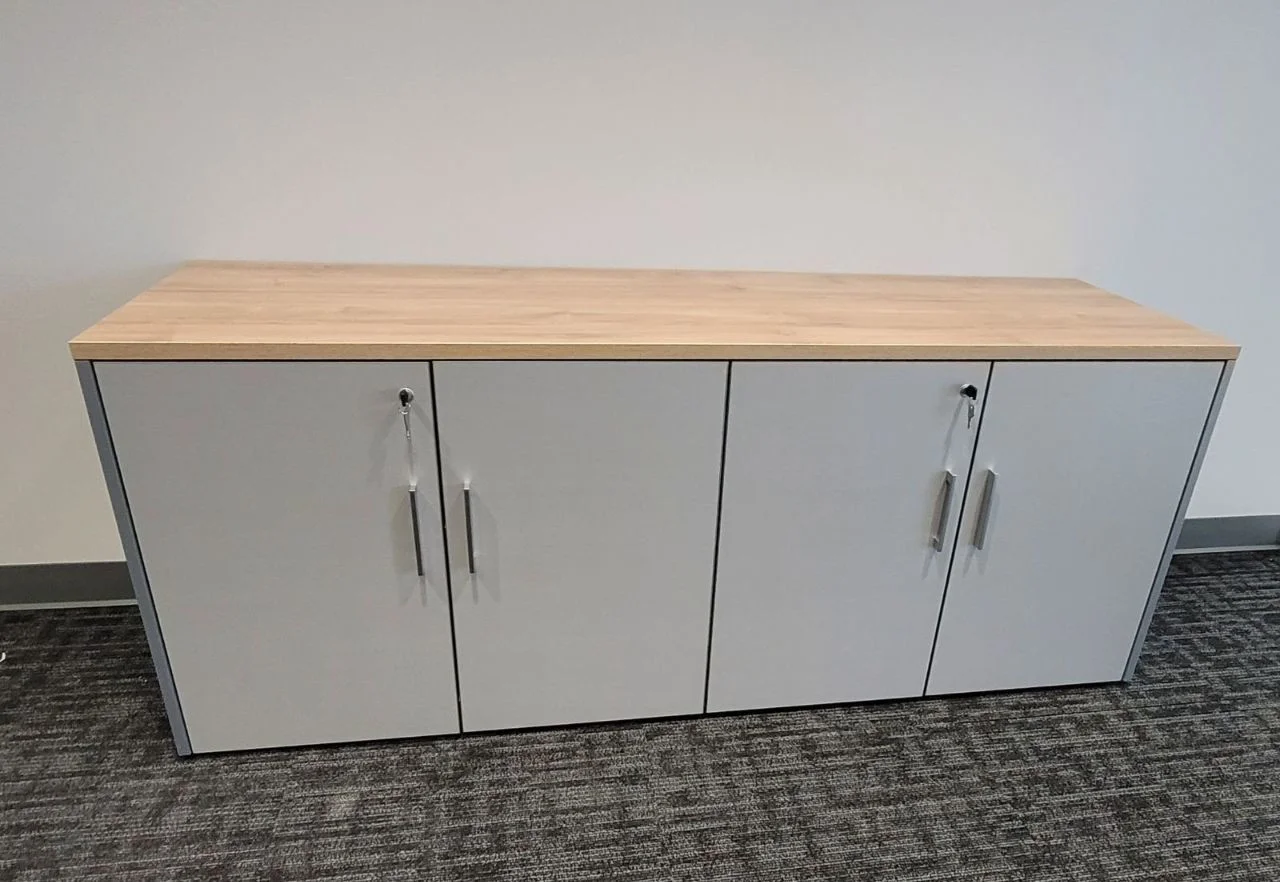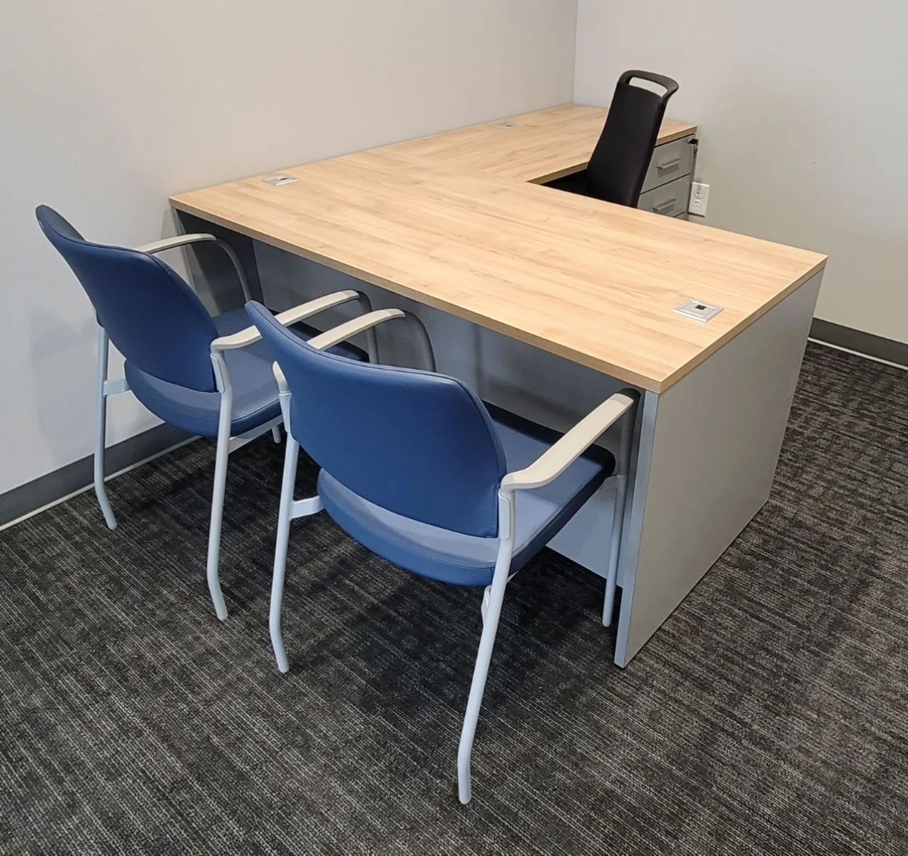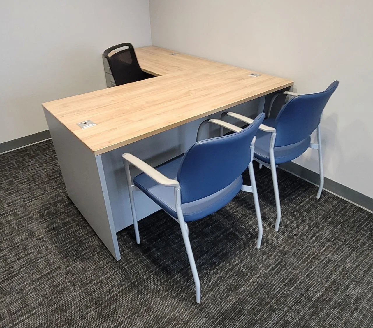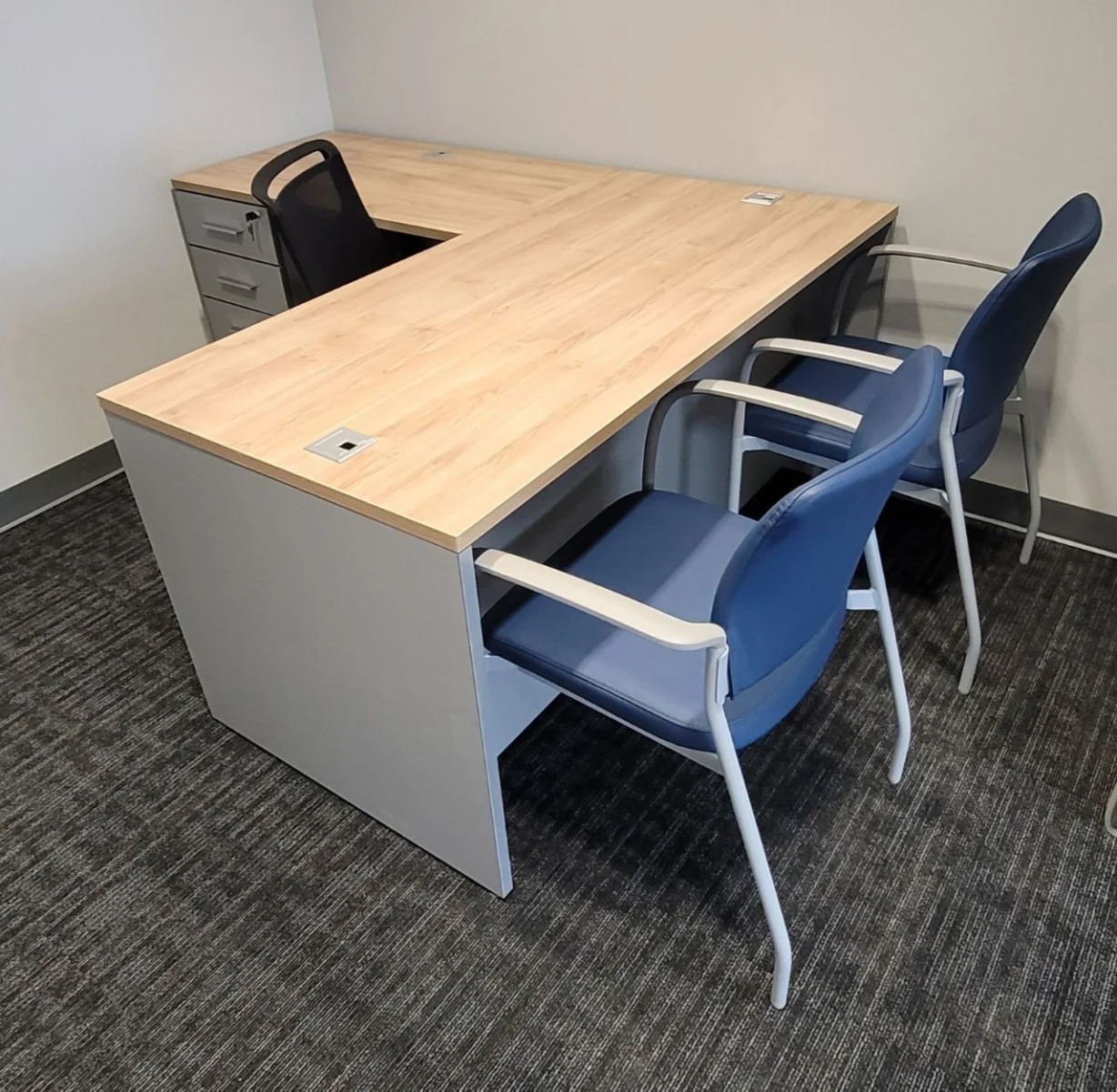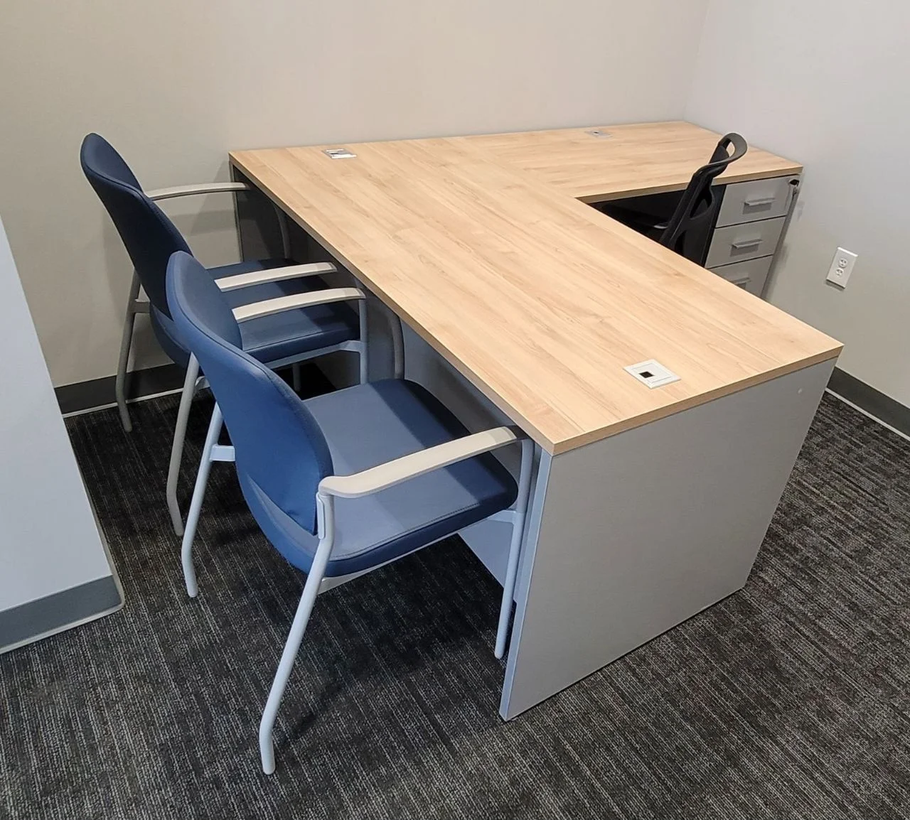 There were many L-shaped office desks with wood-grain work surfaces and neutral base cabinets put in private offices. These workstations have built-in power access, a clean surface alignment, and plenty of room for daily administrative tasks. Matching lateral file storage and credenza units were placed flush against the walls, keeping things neat and maintaining the office’s look. The way the desks were set up made it easy for people to move around and see clearly in each room.