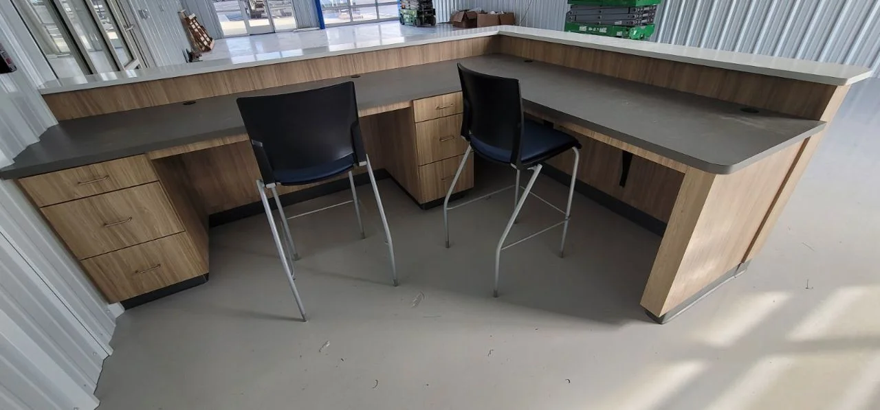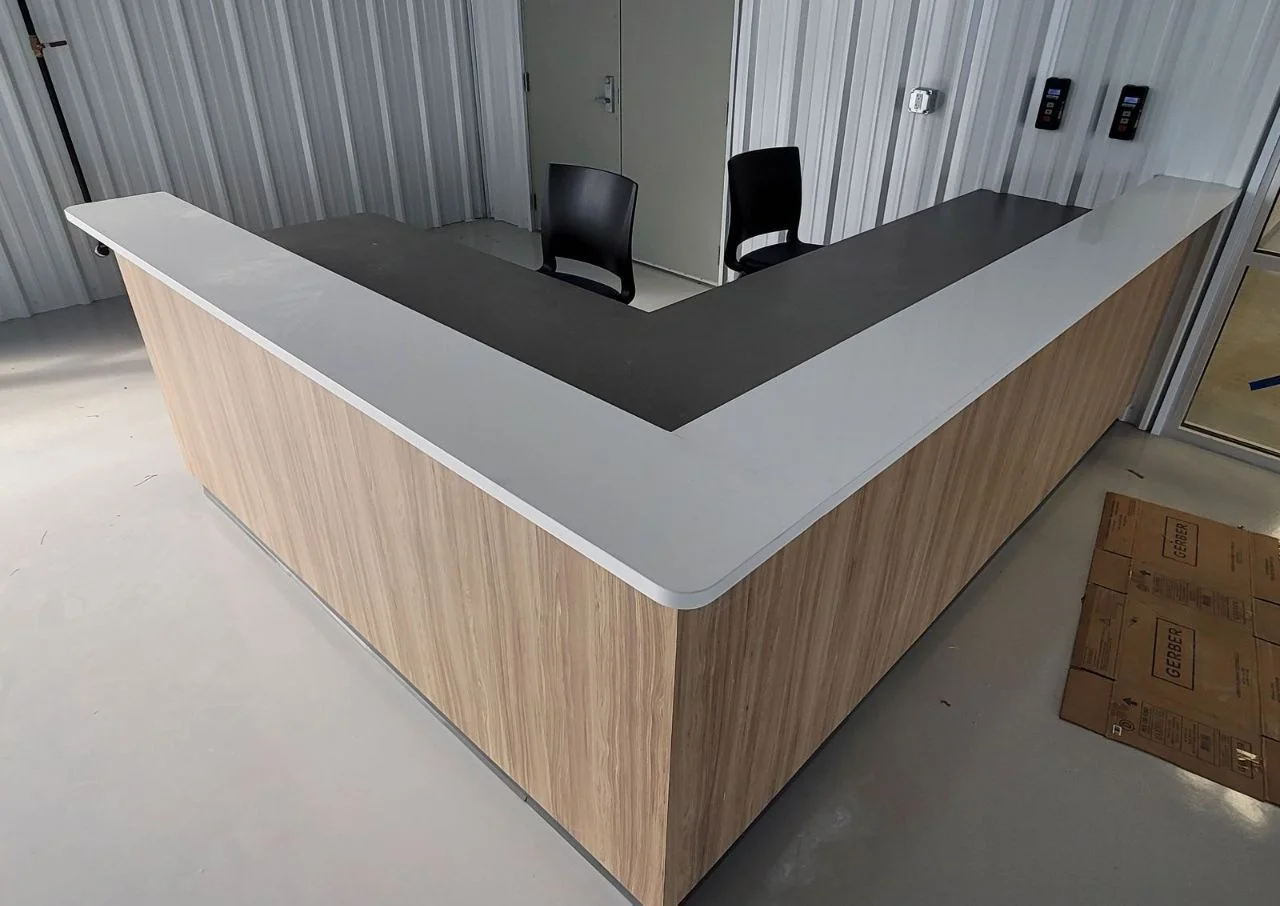 The project involved installing reception-style counters with strong work surfaces and wrapped panels that could withstand heavy traffic. These counters are useful for transactions and look nice, too. Seating was placed behind the counters to make it easier for customers to talk to each other and for administrative tasks to be completed. We carefully aligned the heights of the counters and corners so the finish looked clean and professional from every angle.