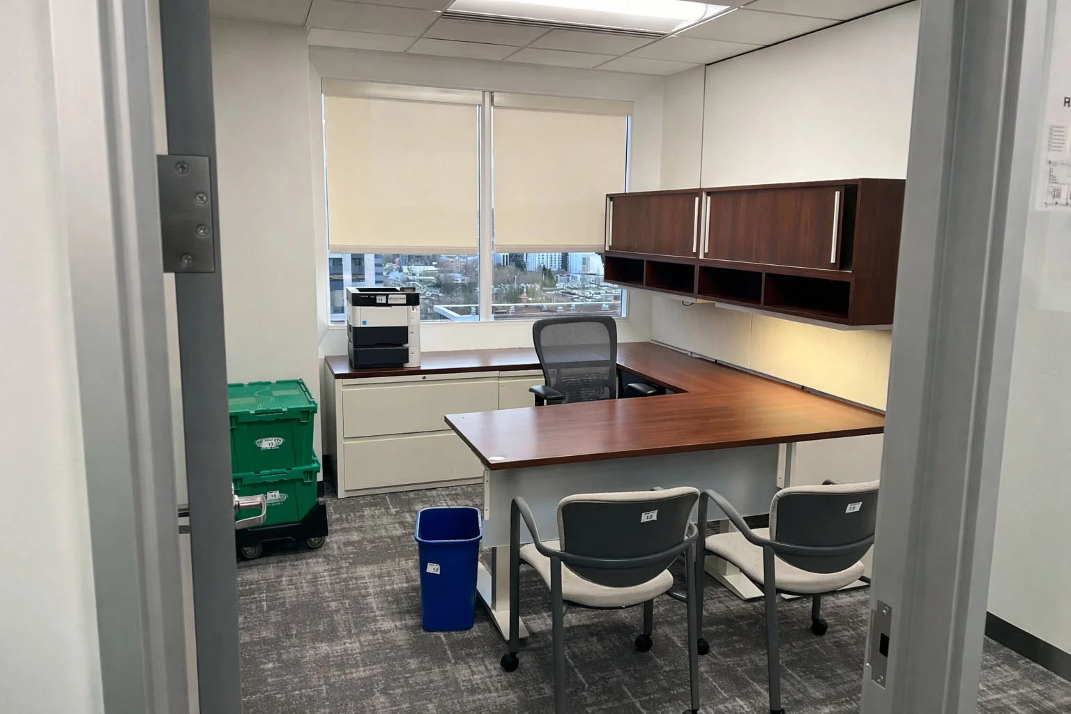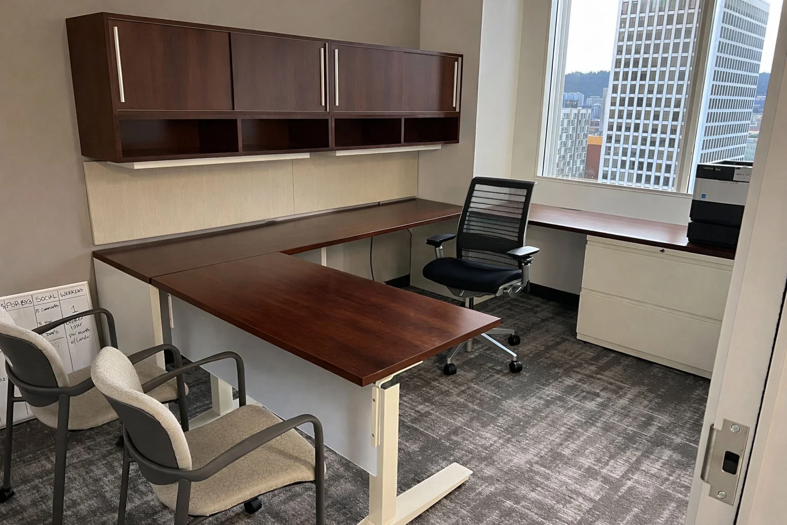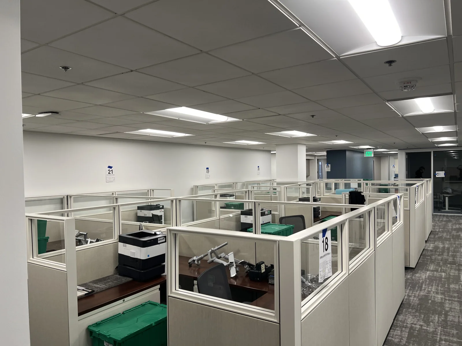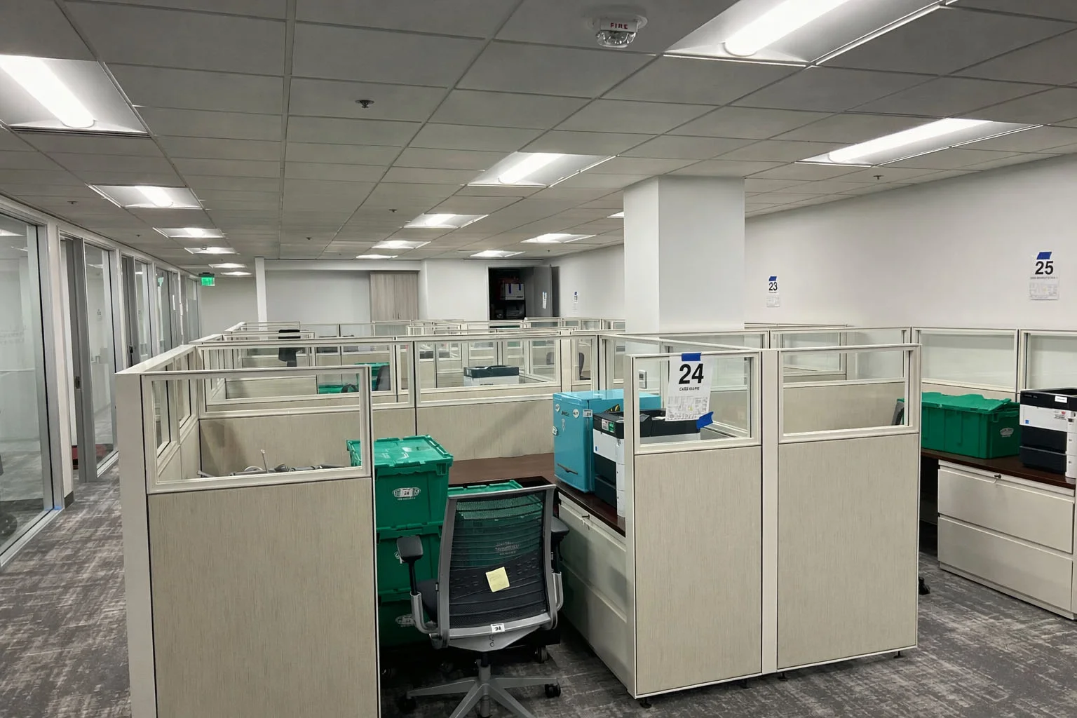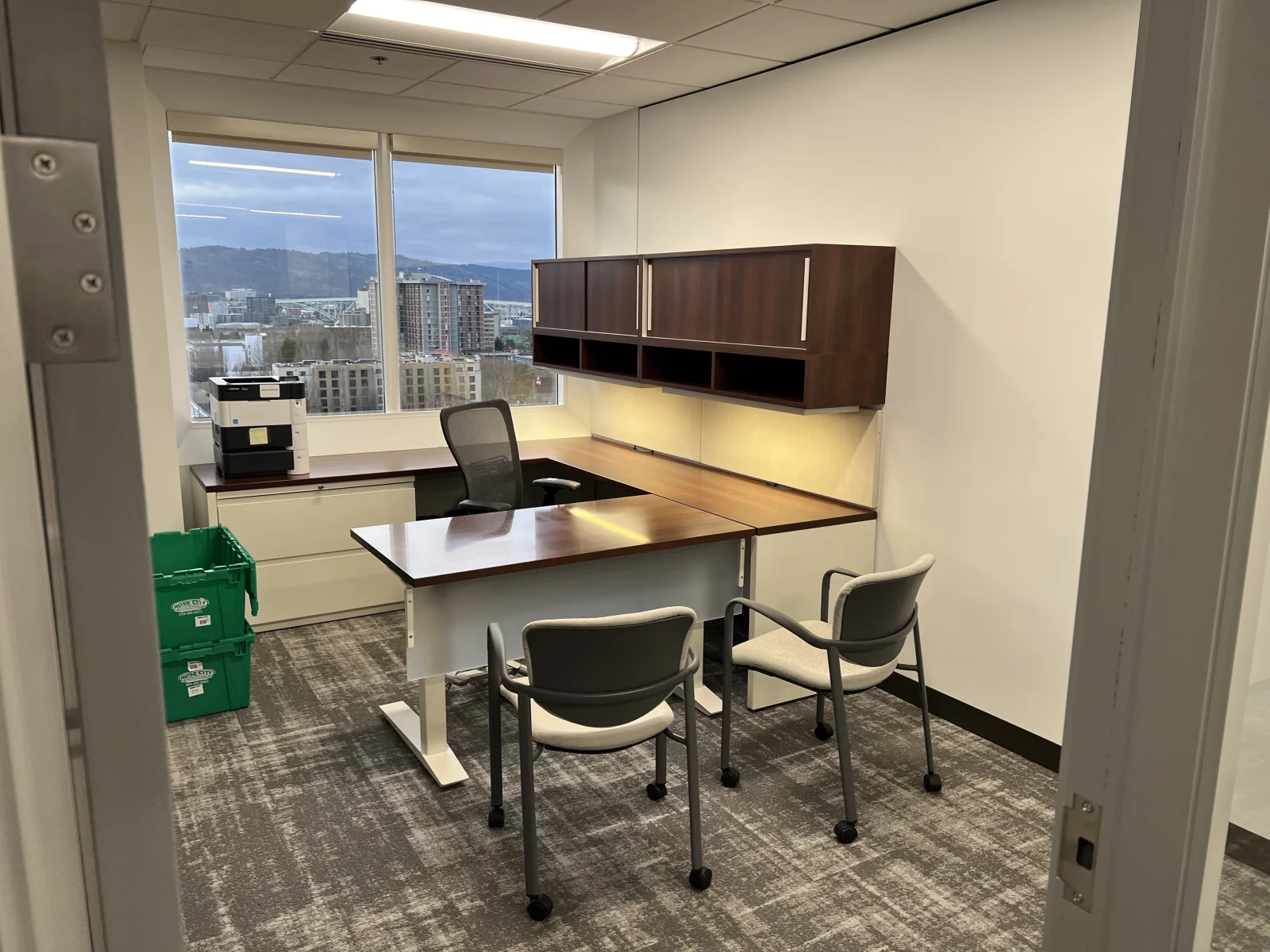 All of the assets were packed up, moved, and brought to the new Portland office. When they got there, the crews worked together to protect the floors, set up staging areas, and confirm the layout. The approved floor plan was used to place the workstations, bringing back the 6×8 Haworth Compose layout in the open office area. We rebuilt the private offices so that the work surfaces were level, overhead storage was provided, and the cables were organized.