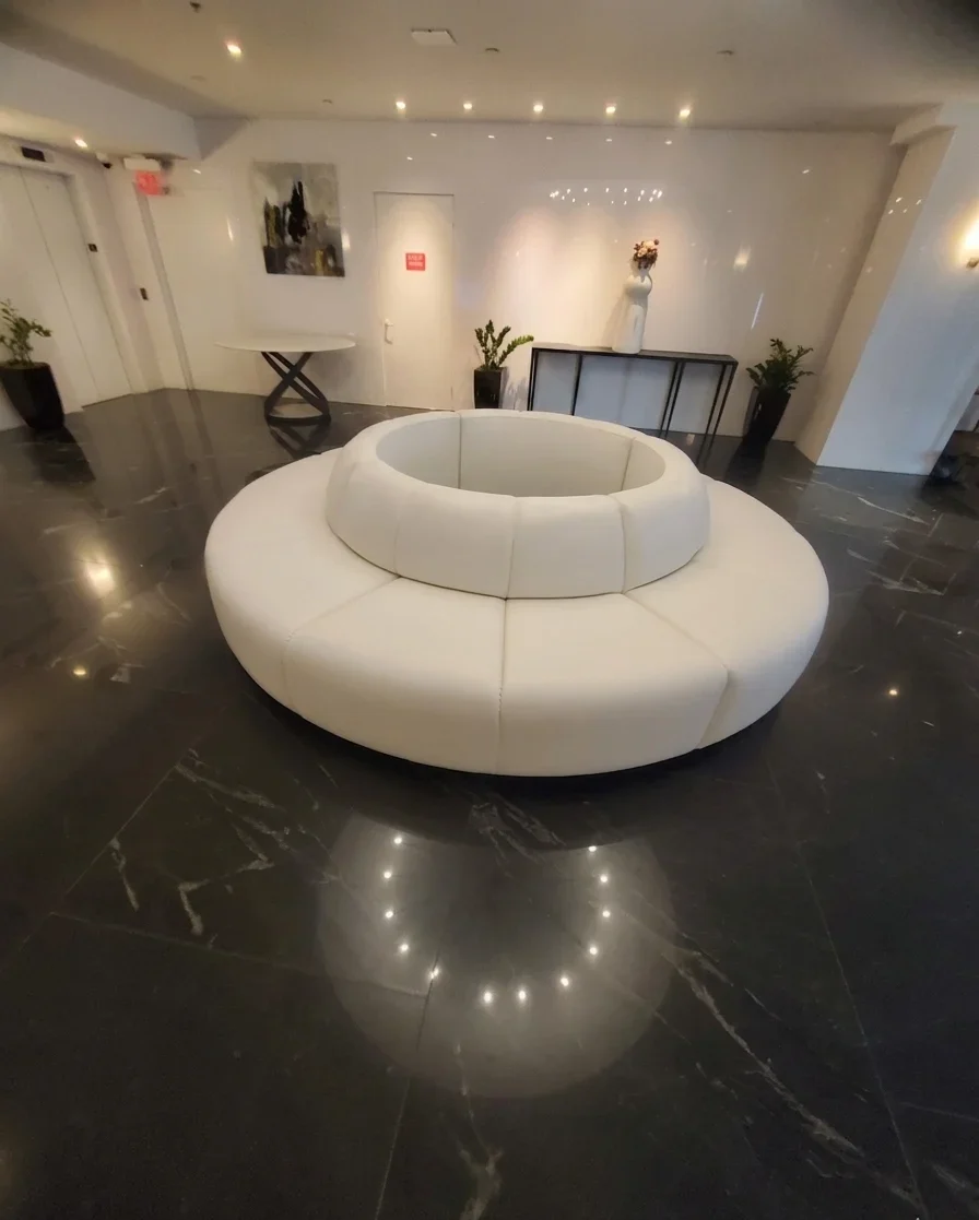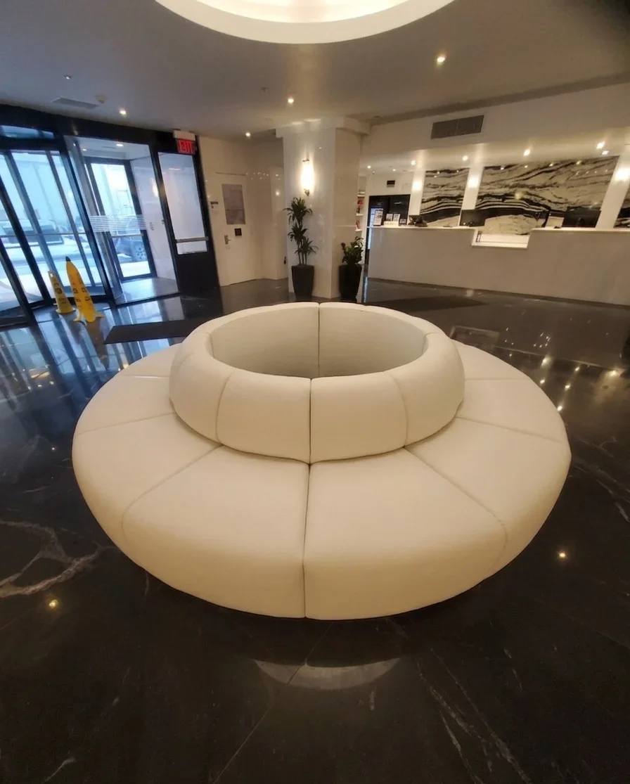 Once assembled, the banquette became the room’s primary focal point. The lobby looked better because of its clean lines and balanced proportions. The right placement ensured that the seating was both useful and in keeping with the rest of the space.
