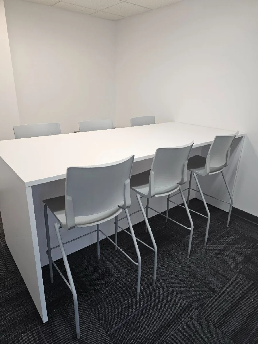 Conference and meeting rooms were set up to facilitate communication and maximize space. Rectangular tables have a lot of surface area for laptops, papers, and personal devices, but they don’t take up much space. The chairs are arranged so people can move around the room quickly, reducing traffic during meetings. These areas are suitable for working together within the company, meeting with clients on a set schedule, and having small-group discussions.