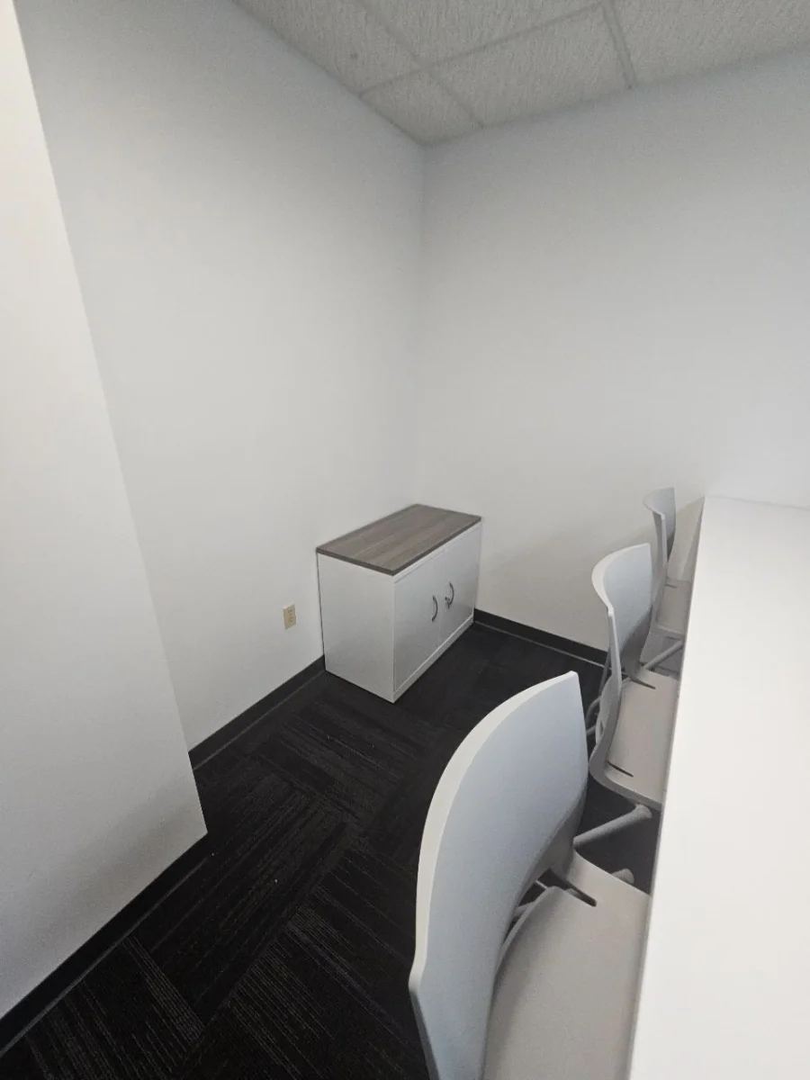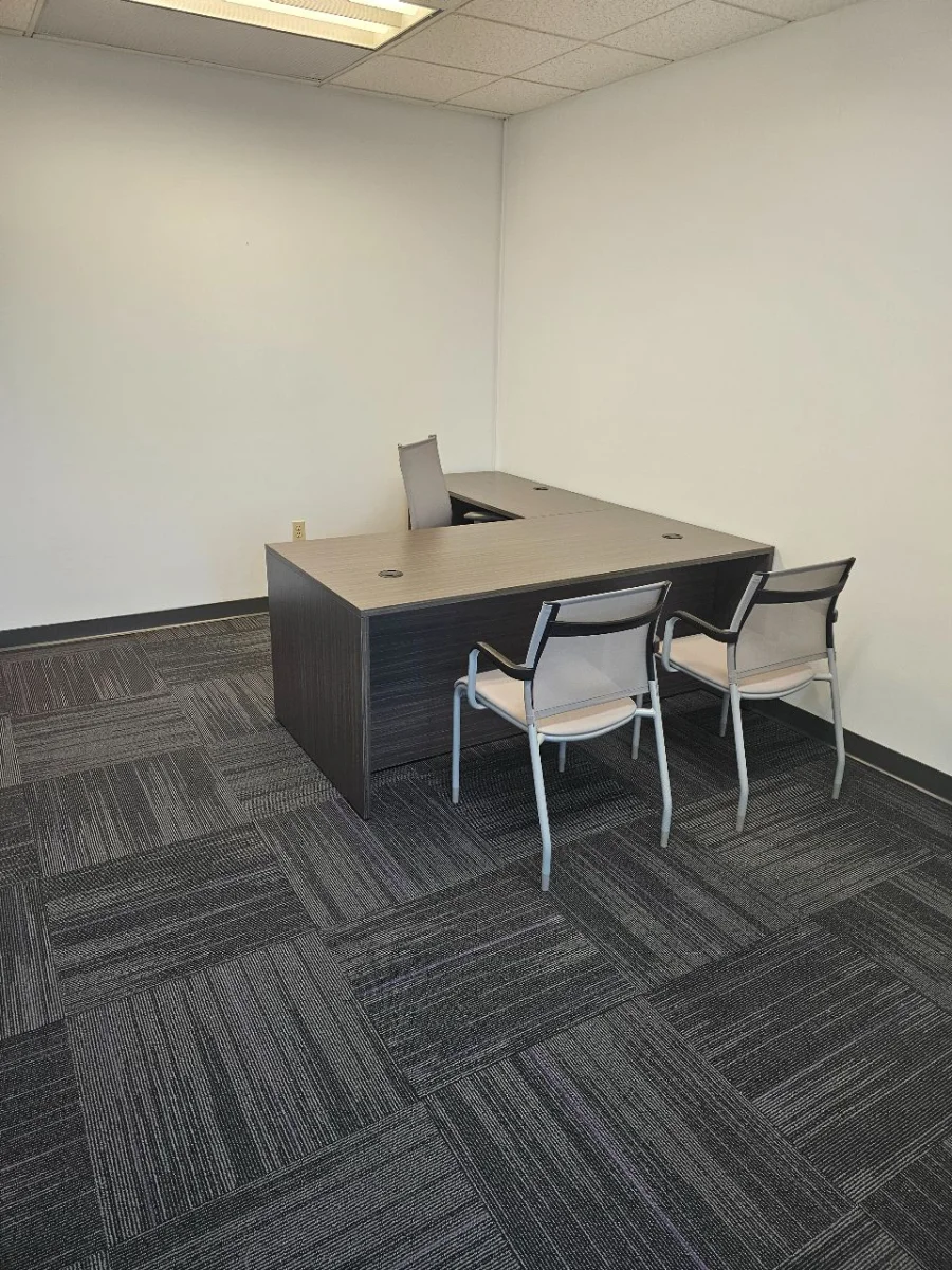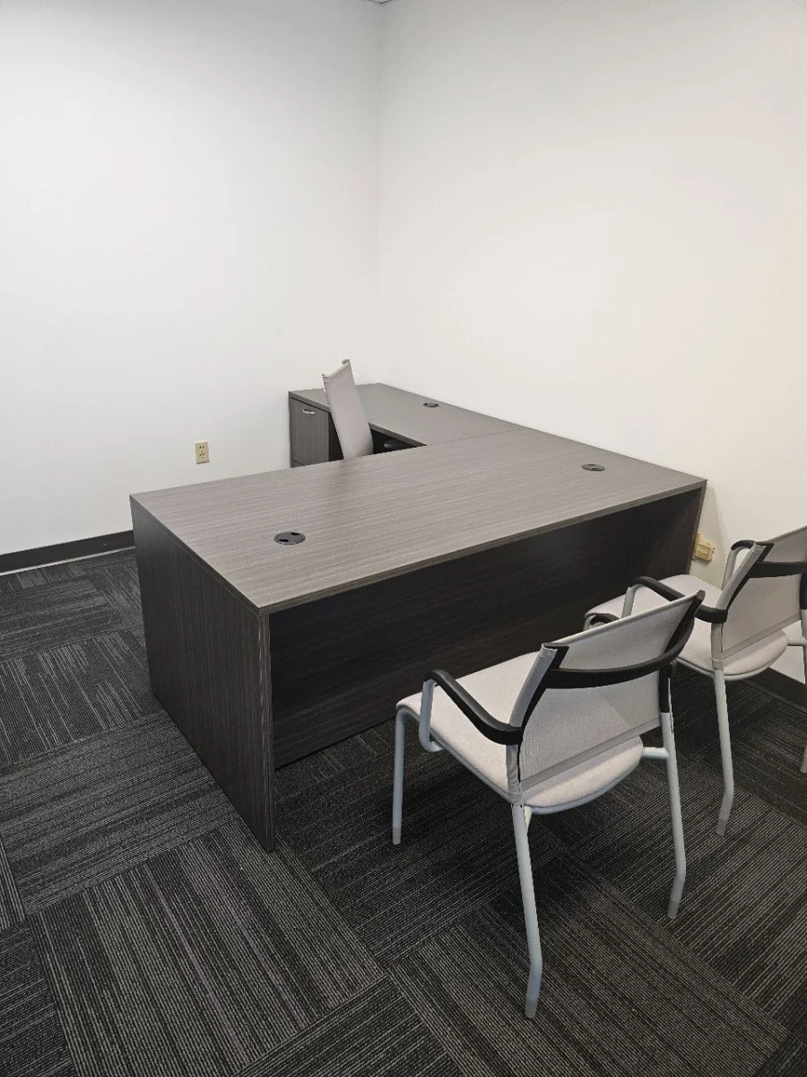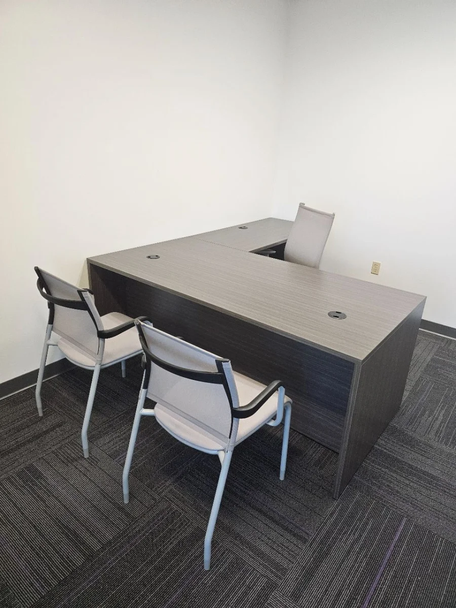 The workspace has private offices and small meeting rooms with modern desks and matching guest seating. Each desk has built-in power grommets that help keep cables organized and make it easier to use technology every day. The guest chairs are arranged so people can talk face-to-face while still having enough space. The same color scheme for desks and chairs gives the office a professional and unified look.